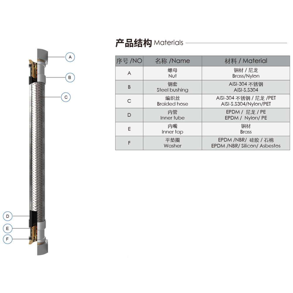 型号:智能马桶管软管外径:15mm/16mm/18mm/22mm 软管内径: 10.6mm/11.5mm/13mm/15.9mm 接头内孔直径:7mm/8.5mm/10.5mm/13mm 最小弯曲度: 25mm/30mm 工作温度: ≤ 90℃ 工作压力:≤ 30 Bar